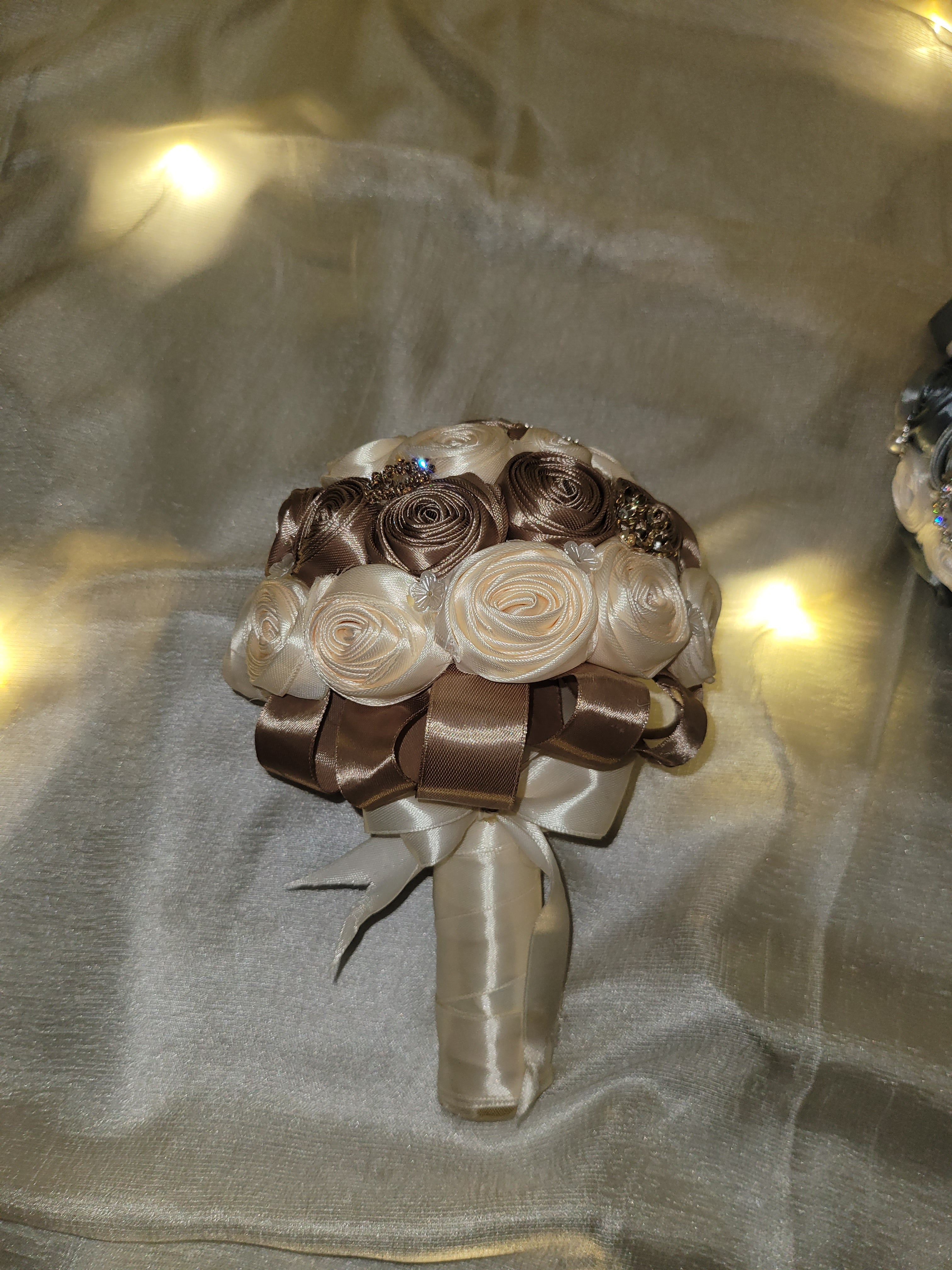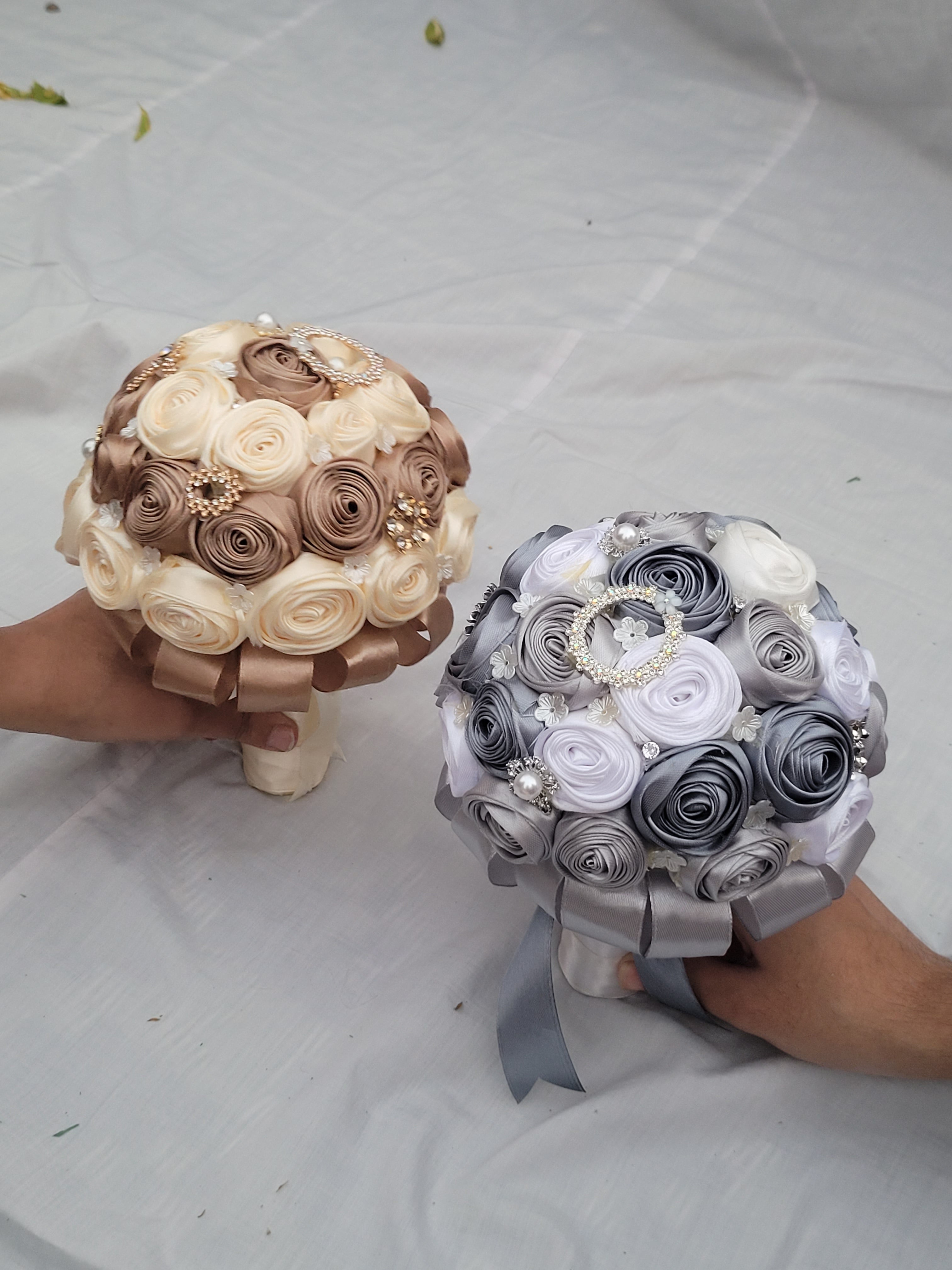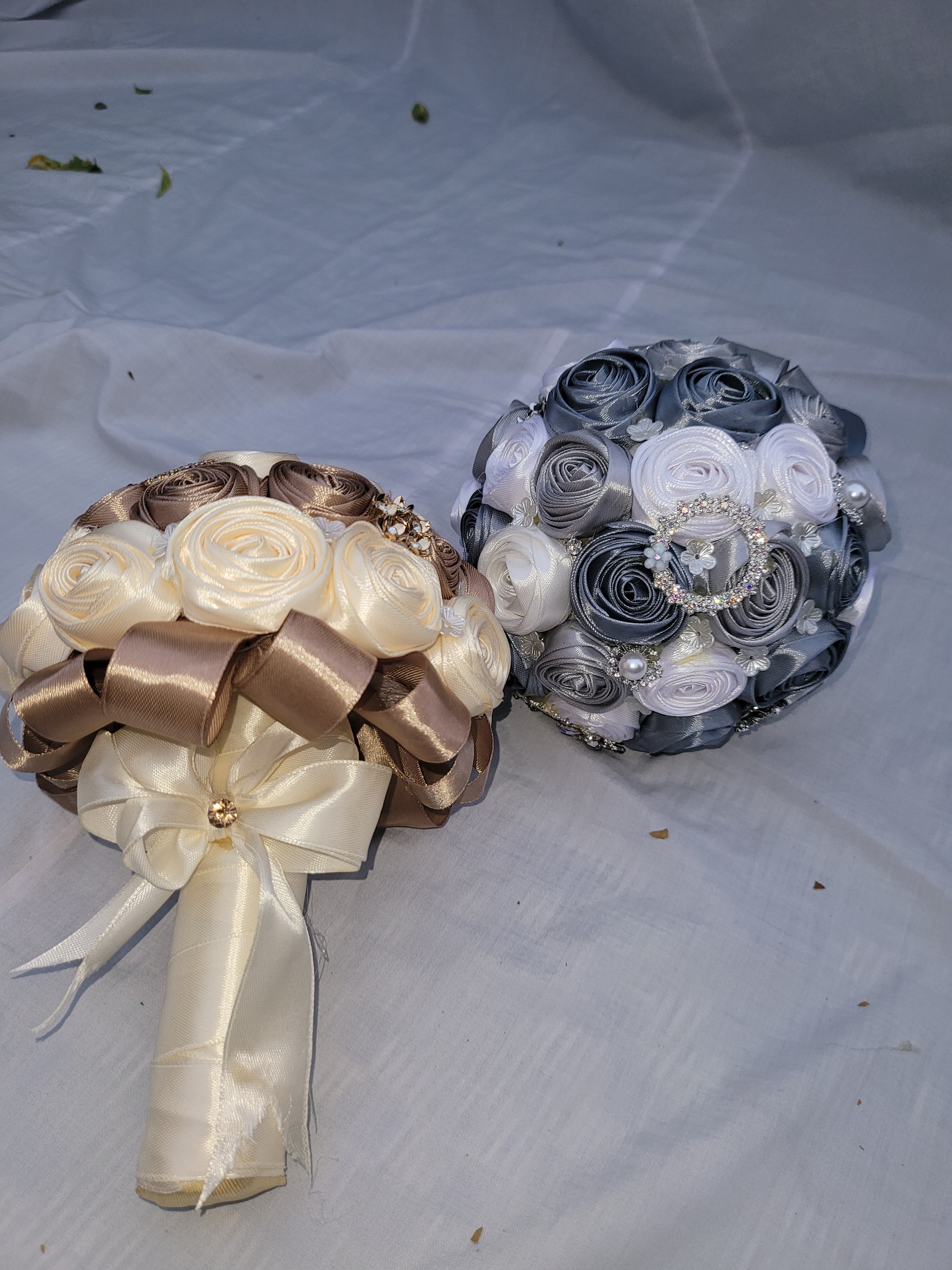 Elevate your special day with our Handcrafted Satin Ribbon Rose Bouquet, made with premium satin ribbons shaped into elegant, long-lasting roses. Each bouquet is crafted with care to give a luxurious, timeless look—perfect for brides and event décor.